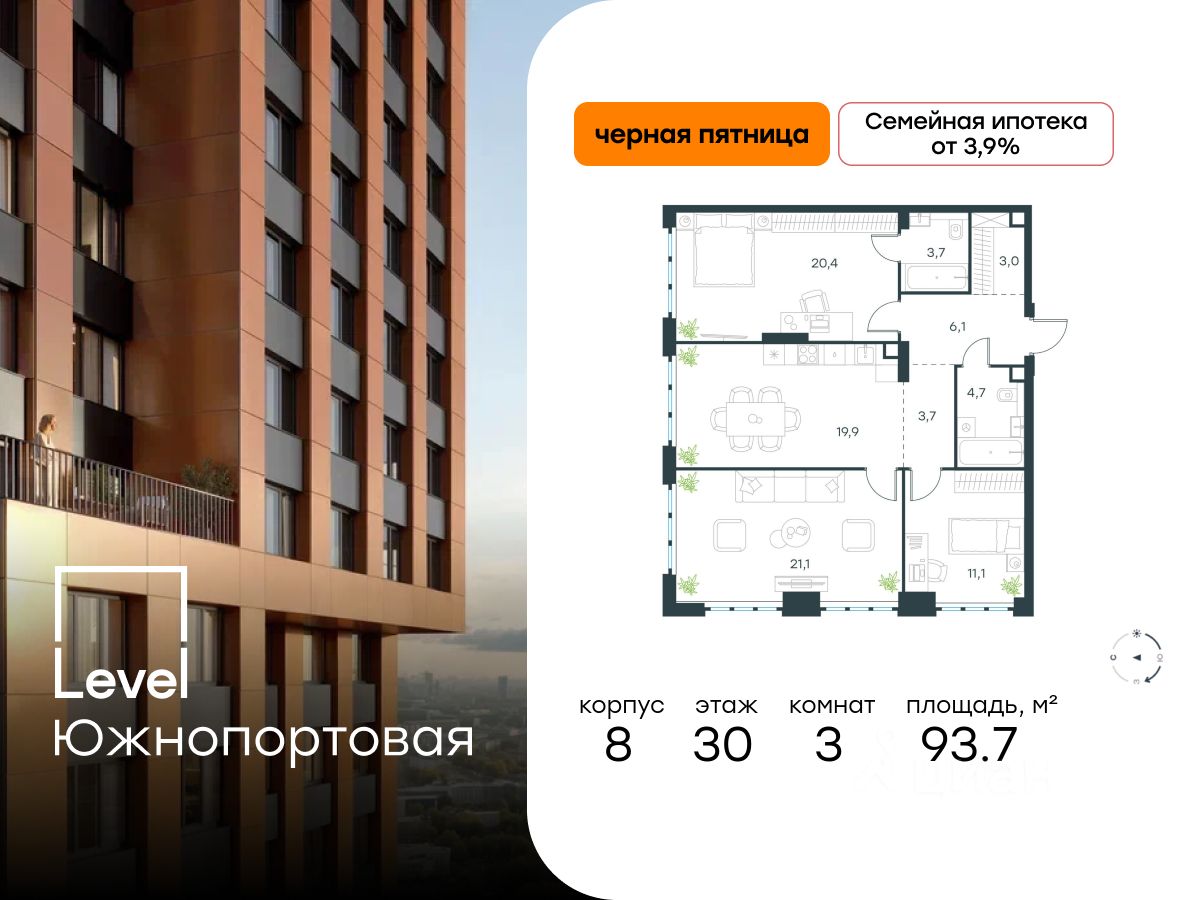 В северной части района Печатники продается 3-комнатная квартира площадью 93.70 кв.м без отделки. Квартира расположена на 30 этаже 49-этажного корпуса Корпус 8 в жилом комплексе комфорт-класса Level Южнопортовая (компания Level Group/Левел групп).