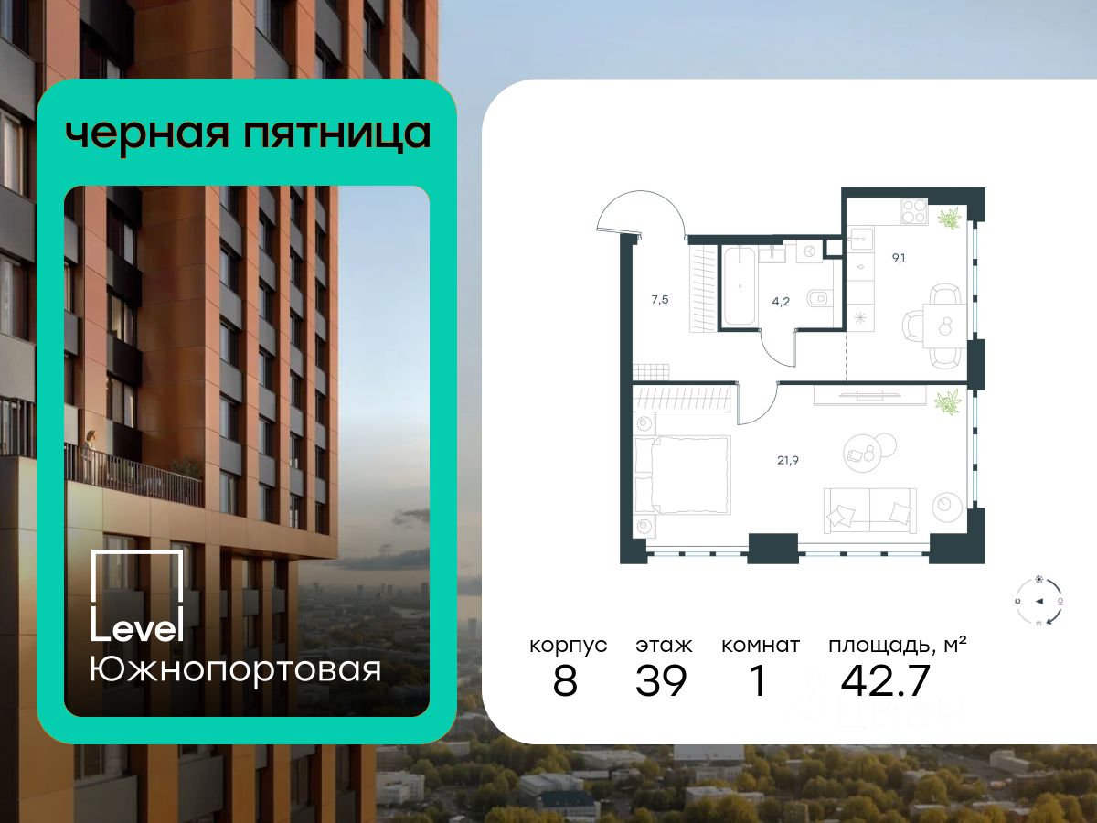 В северной части района Печатники продается 1-комнатная квартира площадью 42.70 кв.м без отделки. Квартира расположена на 39 этаже 49-этажного корпуса Корпус 8 в жилом комплексе комфорт-класса Level Южнопортовая (компания Level Group/Левел групп).