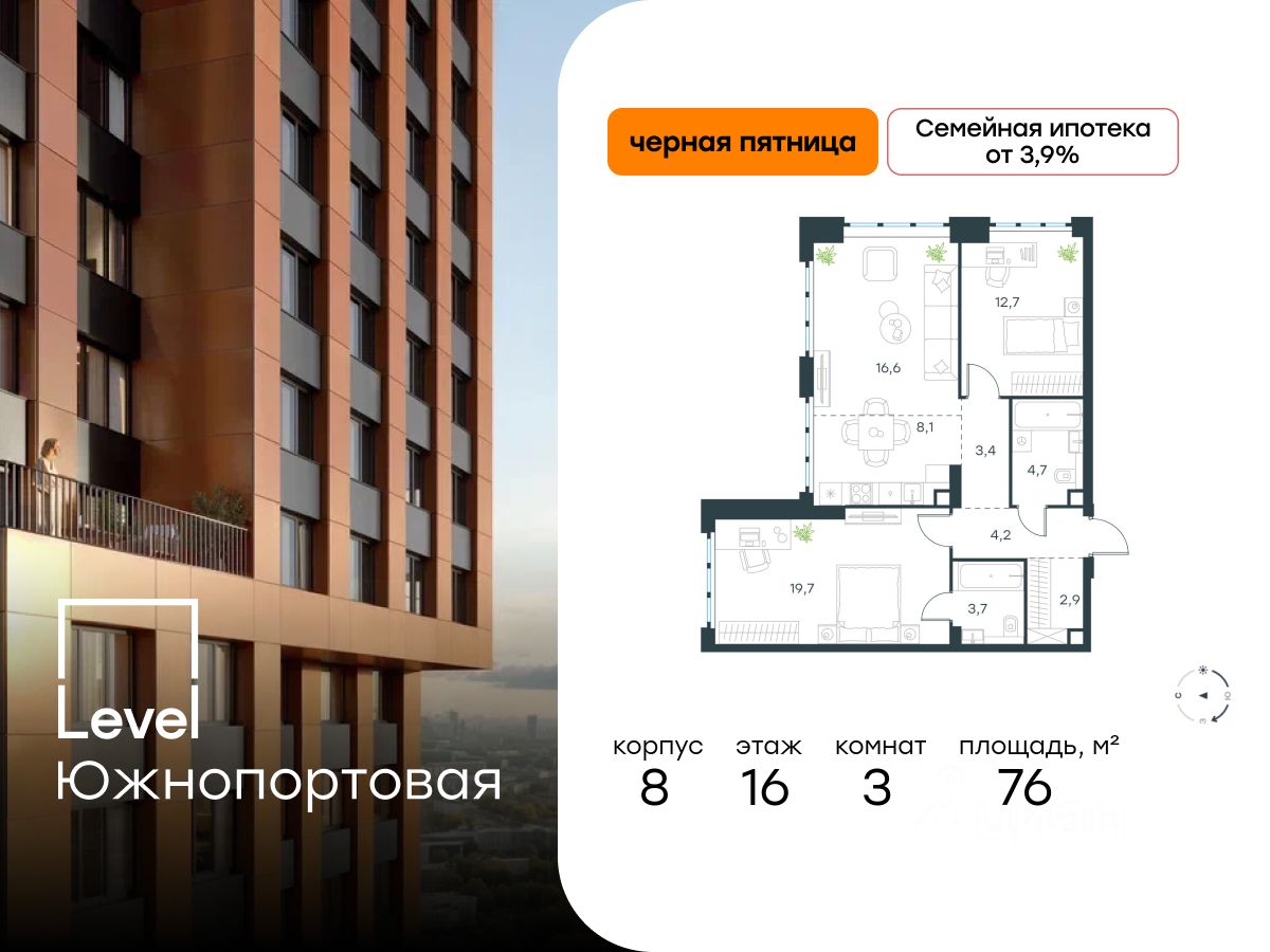 В северной части района Печатники продается 3-комнатная квартира площадью 76.00 кв.м без отделки. Квартира расположена на 16 этаже 49-этажного корпуса Корпус 8 в жилом комплексе комфорт-класса Level Южнопортовая (компания Level Group/Левел групп).