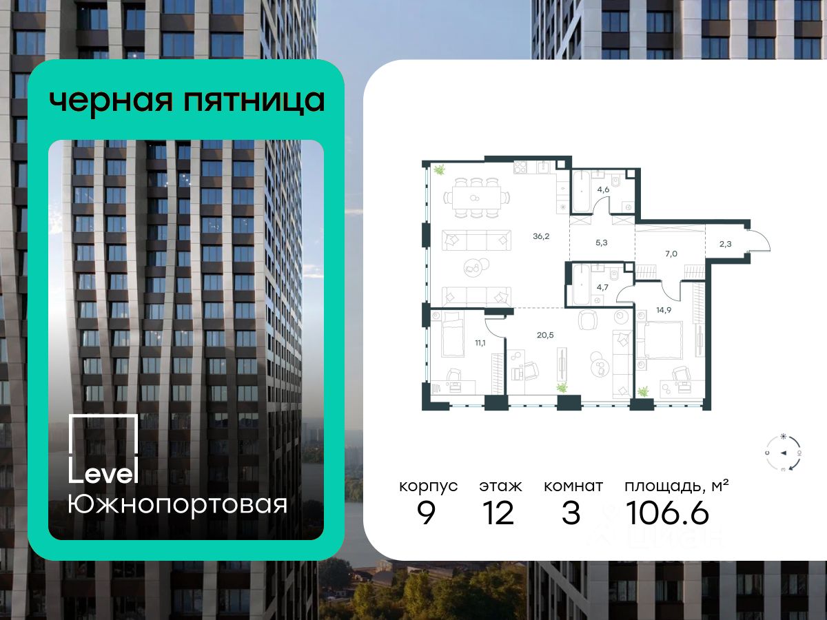 В северной части района Печатники продается 3-комнатная квартира площадью 106.60 кв.м с отделкой white box. Квартира расположена на 12 этаже 49-этажного корпуса Корпус 9 в жилом комплексе комфорт-класса Level Южнопортовая (компания Level Group/Левел групп).