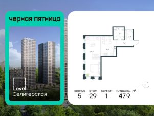 В жилом квартале, расположенном в южной части района Западное Дегунино, продаётся 1-комнатная квартира площадью 47.90 кв.м без отделки. Квартира расположена на 29 этаже 40-этажного корпуса Корпус 5 в жилом комплексе комфорт-класса Level Селигерская (компания Level Group/Левел групп).
