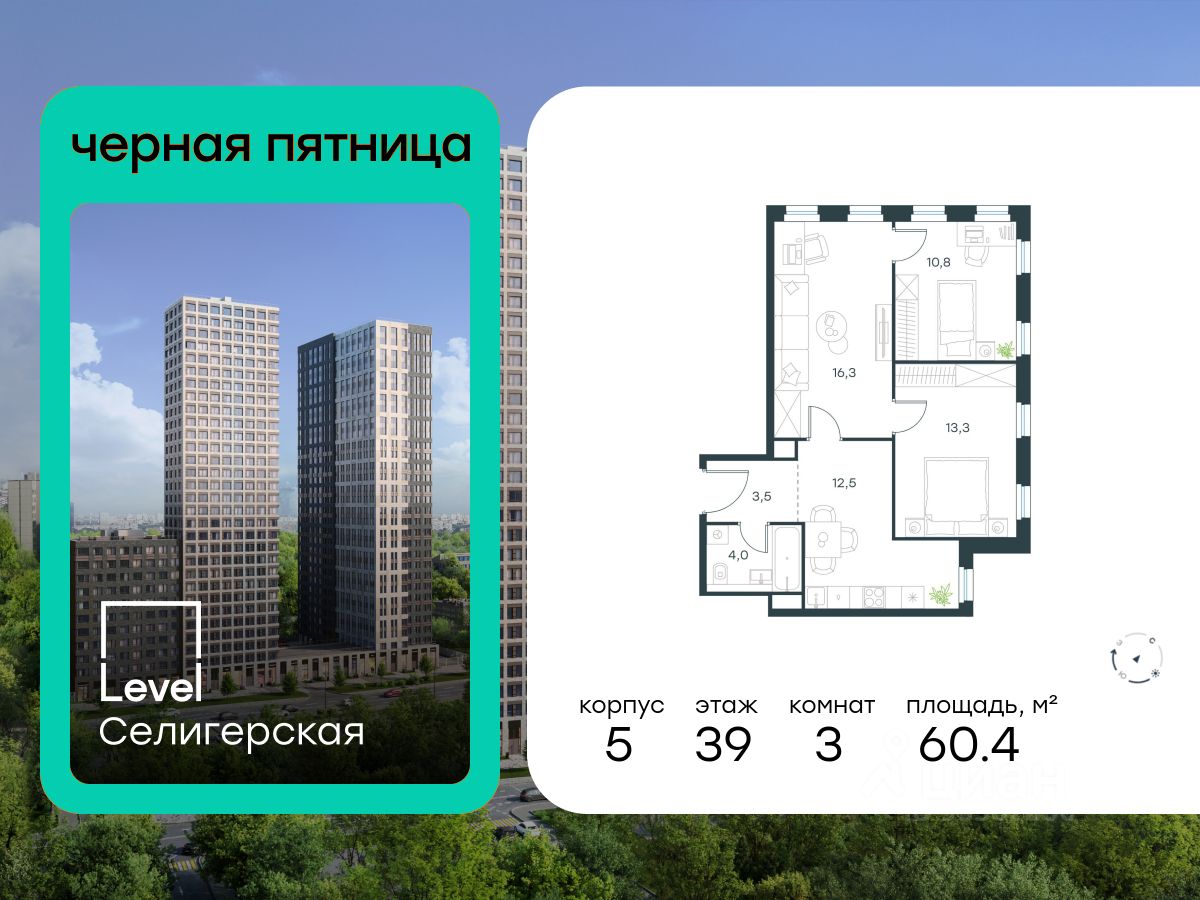 В жилом квартале, расположенном в южной части района Западное Дегунино, продаётся 3-комнатная квартира площадью 60.40 кв.м без отделки. Квартира расположена на 39 этаже 40-этажного корпуса Корпус 5 в жилом комплексе комфорт-класса Level Селигерская (компания Level Group/Левел групп).