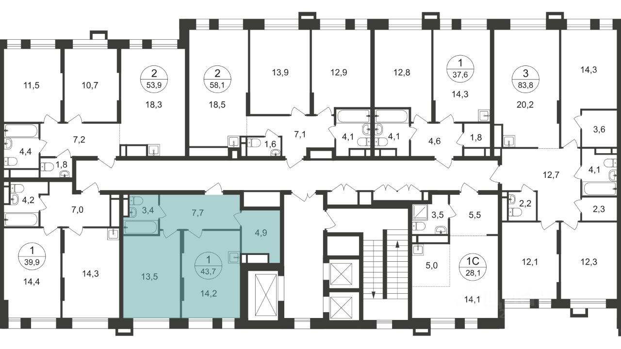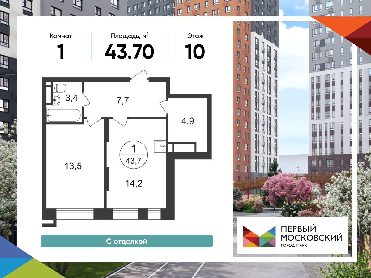 Общая площадь квартиры - 43,7 кв. м, этаж - 10 из 21.