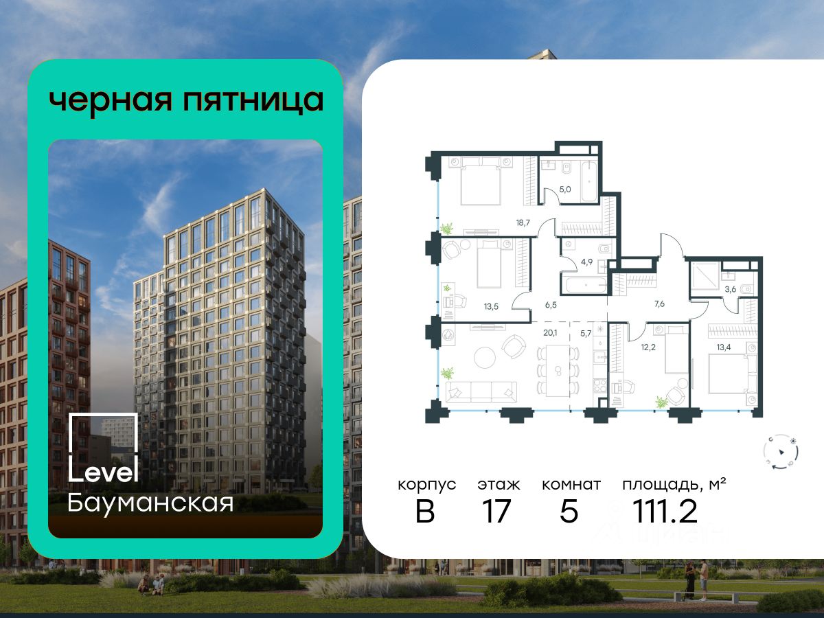В Басманном районе (ЦАО) продается 5-комнатная квартира площадью 111.20 кв.м без отделки. Квартира расположена на 17 этаже 17-этажного корпуса "Корпус B" в жилом комплексе бизнес-класса Level Бауманская (компания Level Group).