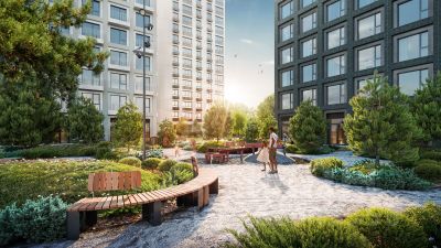 Концепция благоустройства создана в соавторстве с именитым бюро GAFA. На площади 0,35 га расположатся зоны для отдыха, занятий спортом и прогулок. Во дворе можно не только отдохнуть, но и поработать на свежем воздухе: для жителей жилого комплекса будет создан коворкинг прямо во дворе - открытые беседки и Wi-Fi на территории. Атмосферу приватности подчеркнёт обилие растительности - деревья и кустарники займут 50% двора. За счёт большого количества хвойных насаждений территория жилого комплекса будет зелёной круглый год.