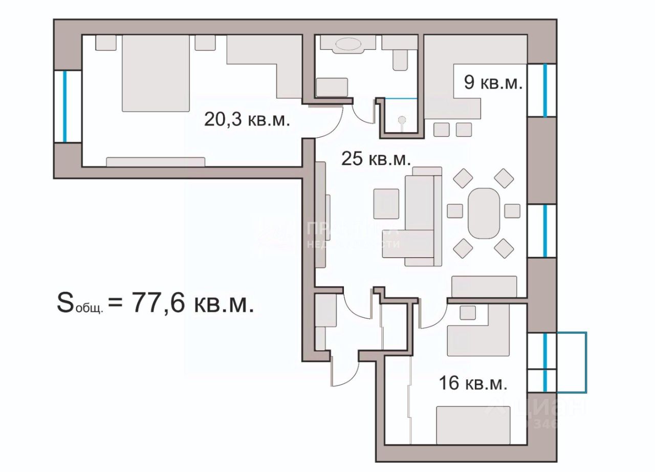 - Общая площадь: 77,6 кв. м.