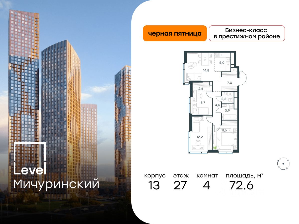 В жилом квартале, расположенном на границе с природным заказником "Долина реки Очаковки", продаётся 4-комнатная квартира площадью 72.60 кв.м без отделки. Квартира расположена на 27 этаже 31-этажного корпуса Корпус 13 в жилом комплексе бизнес-класса Level Мичуринский (компания Level Group/Левел групп).