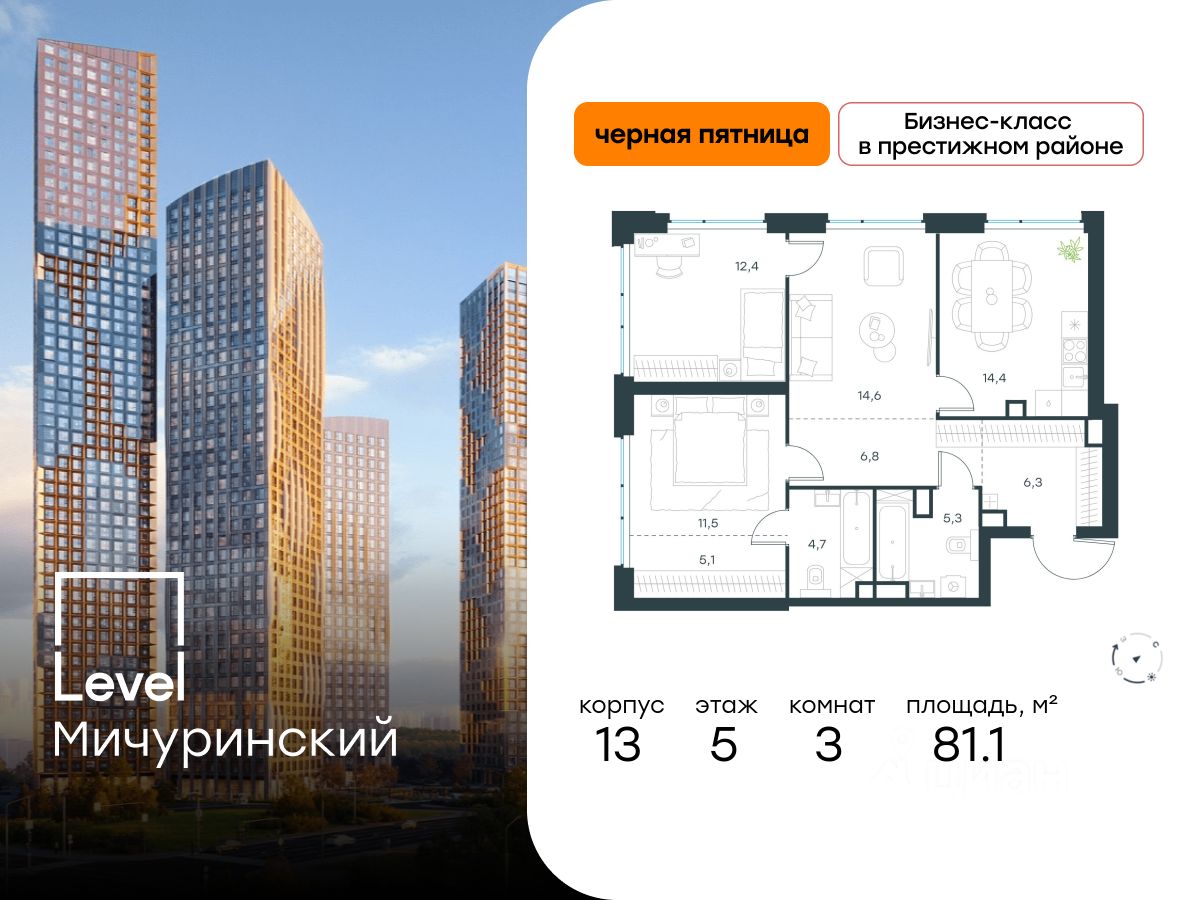 В жилом квартале, расположенном на границе с природным заказником "Долина реки Очаковки", продаётся 3-комнатная квартира площадью 81.10 кв.м без отделки. Квартира расположена на 5 этаже 31-этажного корпуса Корпус 13 в жилом комплексе бизнес-класса Level Мичуринский (компания Level Group/Левел групп).