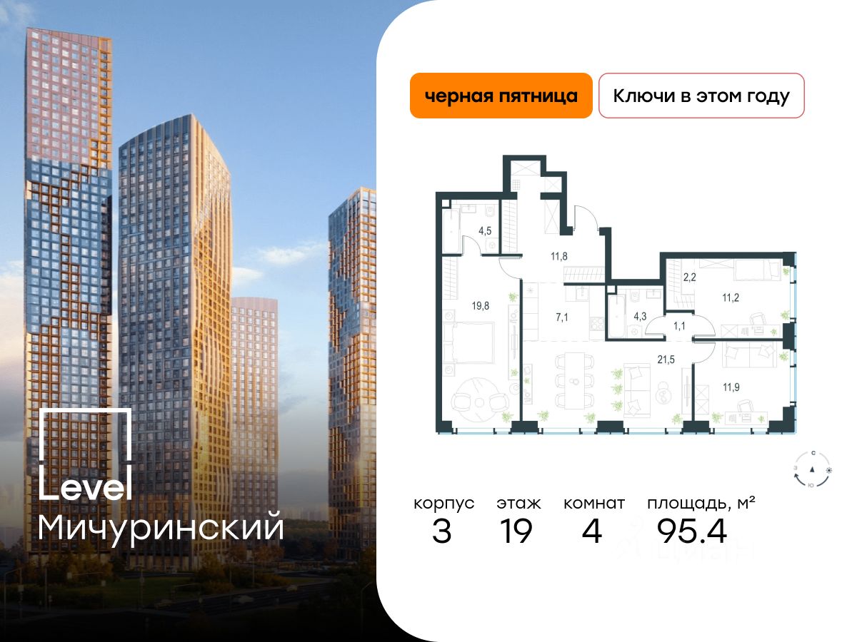 В жилом квартале, расположенном на границе с природным заказником "Долина реки Очаковки", продаётся 4-комнатная квартира площадью 95.40 кв.м с отделкой white box. Квартира расположена на 19 этаже 30-этажного корпуса Корпус 3 в жилом комплексе бизнес-класса Level Мичуринский (компания Level Group/Левел групп).