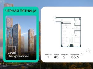 В жилом квартале, расположенном на границе с природным заказником "Долина реки Очаковки", продаётся 2-комнатная квартира площадью 55.60 кв.м без отделки. Квартира расположена на 45 этаже 54-этажного корпуса Корпус 1 в жилом комплексе бизнес-класса Level Мичуринский (компания Level Group/Левел групп).