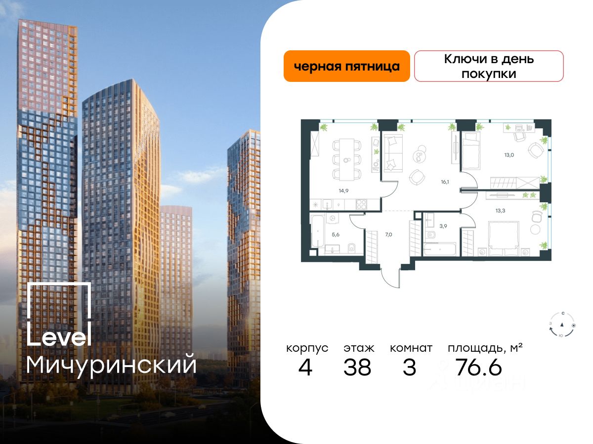 В жилом квартале, расположенном на границе с природным заказником "Долина реки Очаковки", продаётся 3-комнатная квартира площадью 76.60 кв.м без отделки. Квартира расположена на 38 этаже 45-этажного корпуса Корпус 4 в жилом комплексе бизнес-класса Level Мичуринский (компания Level Group/Левел групп).