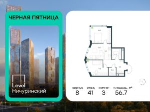 В жилом квартале, расположенном на границе с природным заказником "Долина реки Очаковки", продаётся 3-комнатная квартира площадью 56.70 кв.м без отделки. Квартира расположена на 41 этаже 48-этажного корпуса Корпус 8 в жилом комплексе бизнес-класса Level Мичуринский (компания Level Group/Левел групп).