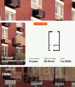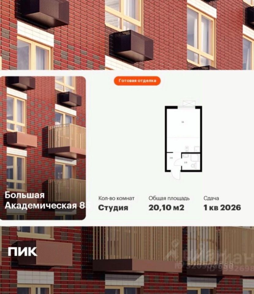 Продаётся студия-апартамент площадью 20.10 кв.м на 13 этаже 14 этажного дома (Корпус 3.5) проекта ПИК Большая Академическая 85. ЧИСТОВАЯ отделка. Светлый просторный подъезд на уровне земли, функциональная планировка, большие окна, с отделкой. Покупалась за наличные, один взрослый собственник, быстрый выход на сделку.