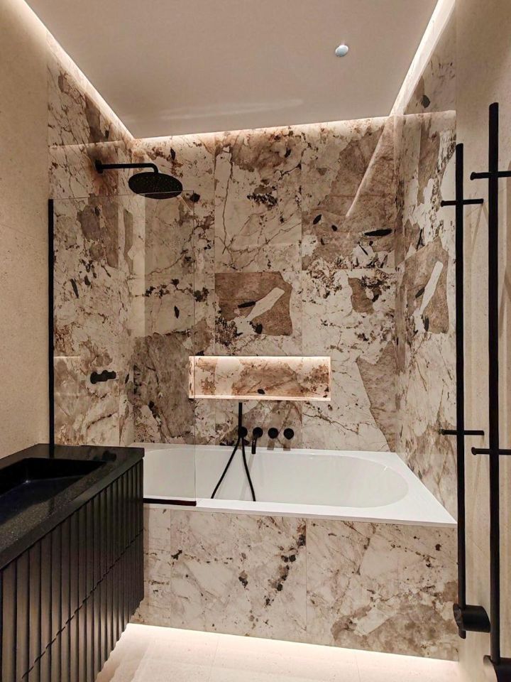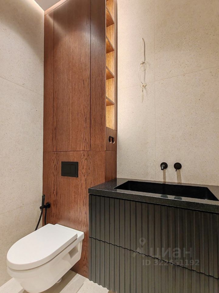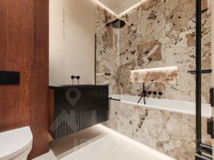 В спальне и сан узле спроектирован парящий потолок с мягкой подсветкой.