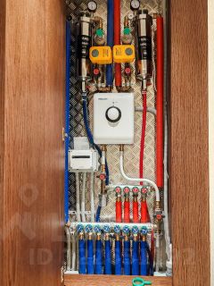 В коридоре выделено место под встраиваемый шкаф, в щитке выведена проводка под каждый осветительный прибор, технику и розетки, также расположен коллектор с отоплением и пожарные датчики.