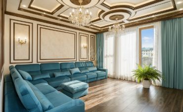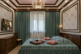 Апартаменты с двумя спальнями общей площадью 92 м² в комплексе Smolensky De Luxe. Выполнен ремонт в классическом стиле. Интерьер выдержан в цветах благородного дерева с мягкими акцентами бирюзы. В отделке использована натуральная древесина и камень. Полы выложены мрамором и тёмным паркетом. Кессонные потолки с резными узорами и золотистыми подвесными люстрами с декором из стекла.