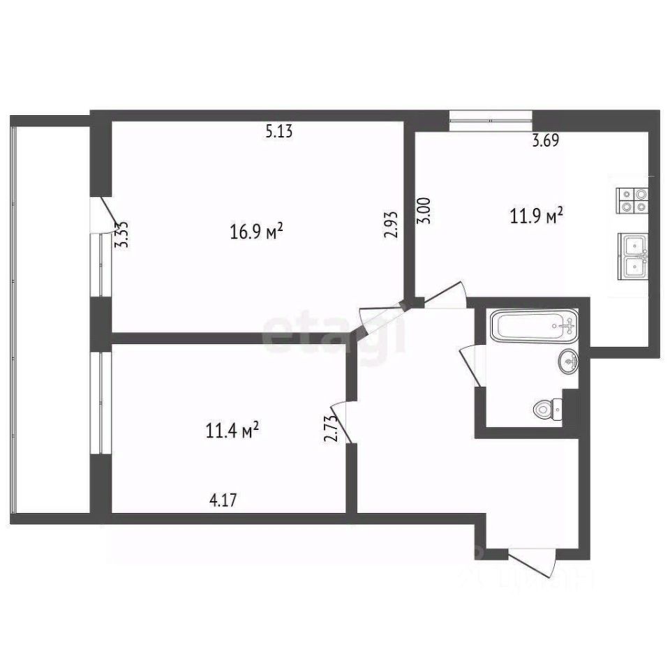 Планировка включает две изолированные комнаты и просторную кухню 11,9 м², что позволяет организовать удобное семейное пространство.