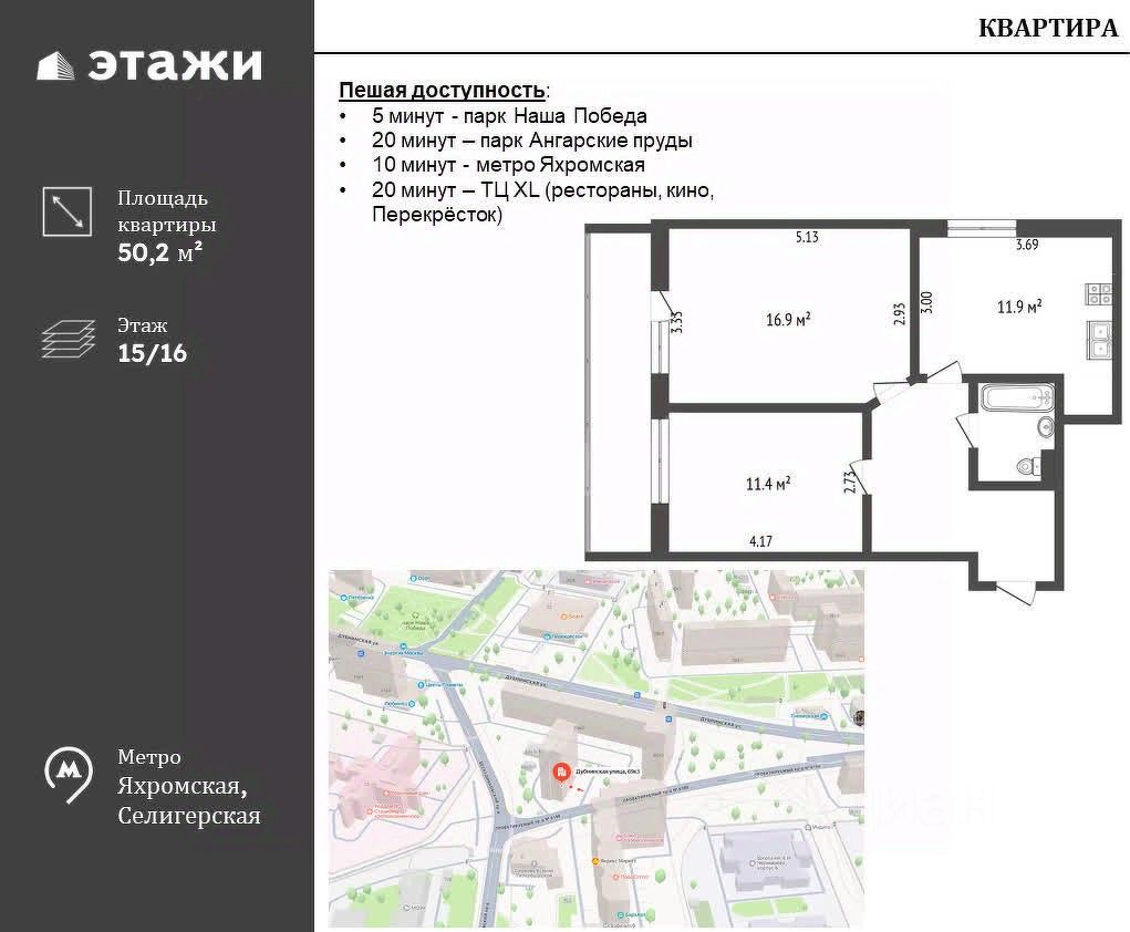 Уютная двухкомнатная квартира площадью 50,2 м² расположена на 15 этаже.