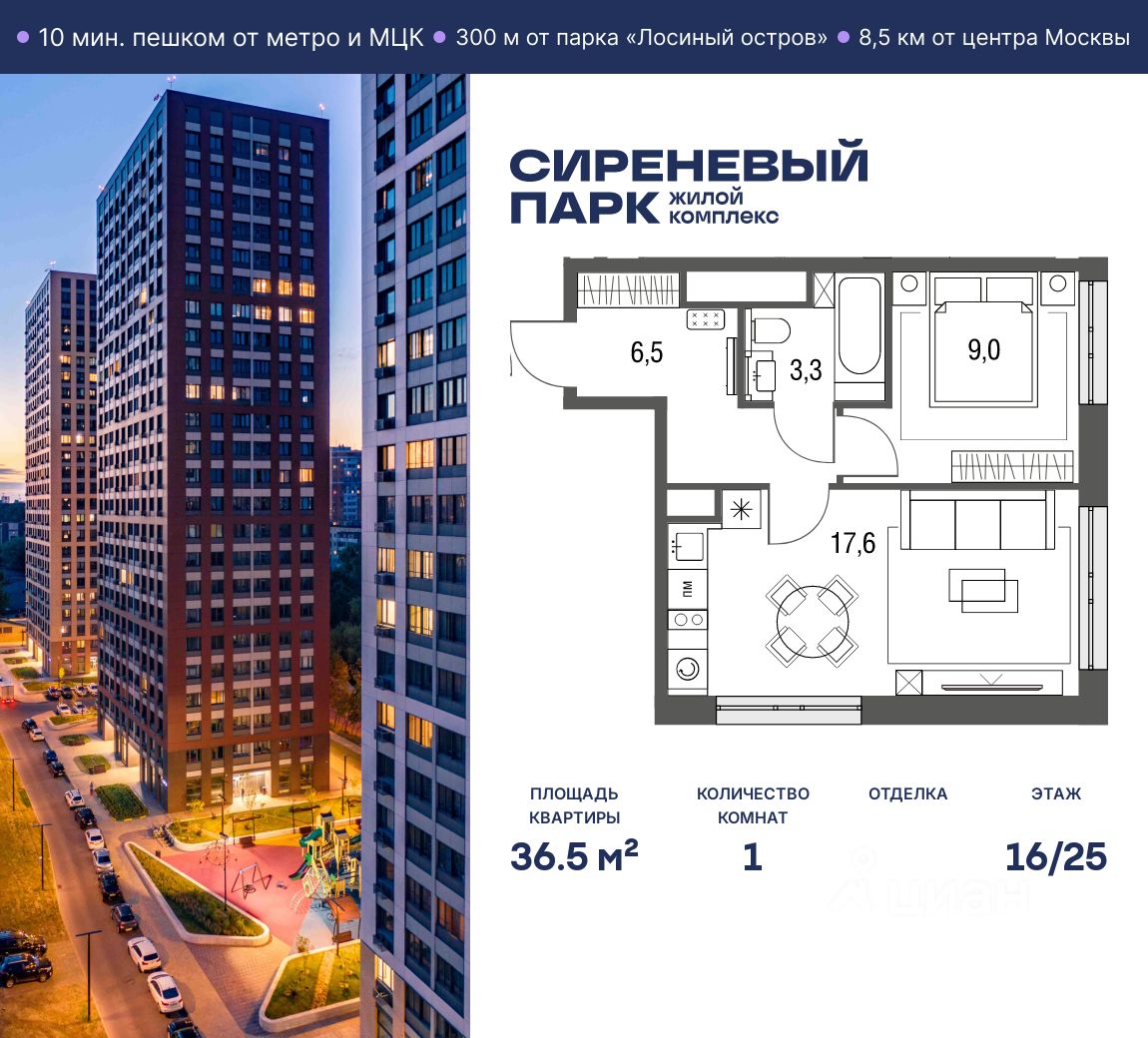 Продаётся просторная 1-комнатная квартира общей площадью 36.5 м² на 16 этаже в новом жилом комплексе "Сиреневый парк", расположенном в Восточном административном округе Москвы на улице Тагильская. Всего 10 минут ходьбы от станции метро "Бульвар Рокоссовского" и одноимённой платформы МЦК.