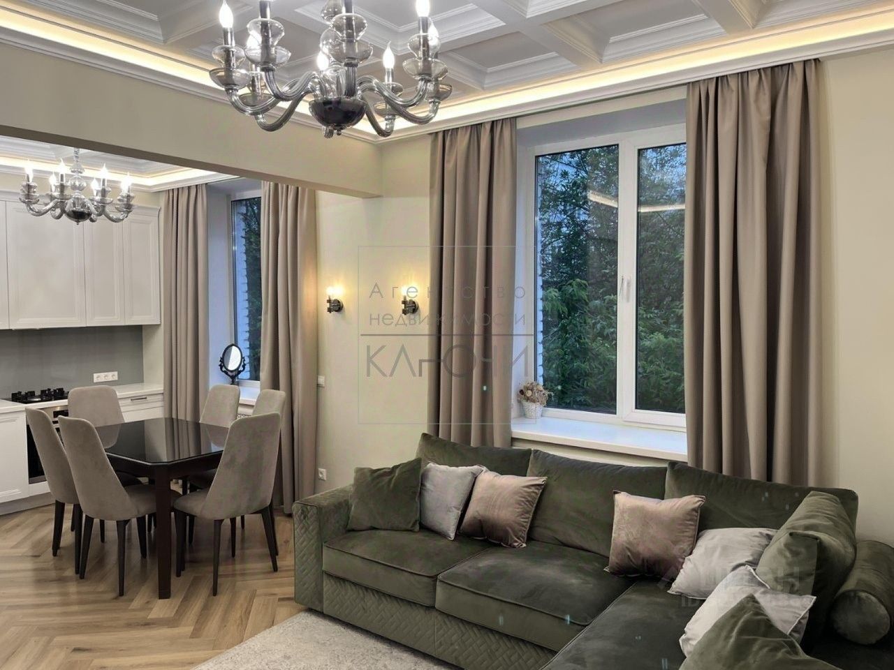 Id 11765. Ваша квартира мечты ждет Вас в сталинском доме с добротными толстыми стенами и внушительной высотой потолков. Пространство наполнено светом и теплом, а дизайнерский ремонт в стиле неоклассика покорит с первого взгляда. В интерьере гармонично сочетаются дорогие материалы: паркетная доска, эксклюзивная мебель под заказ, кессонный потолок в гостиной и эффектная мозаика из плитки в прихожей.