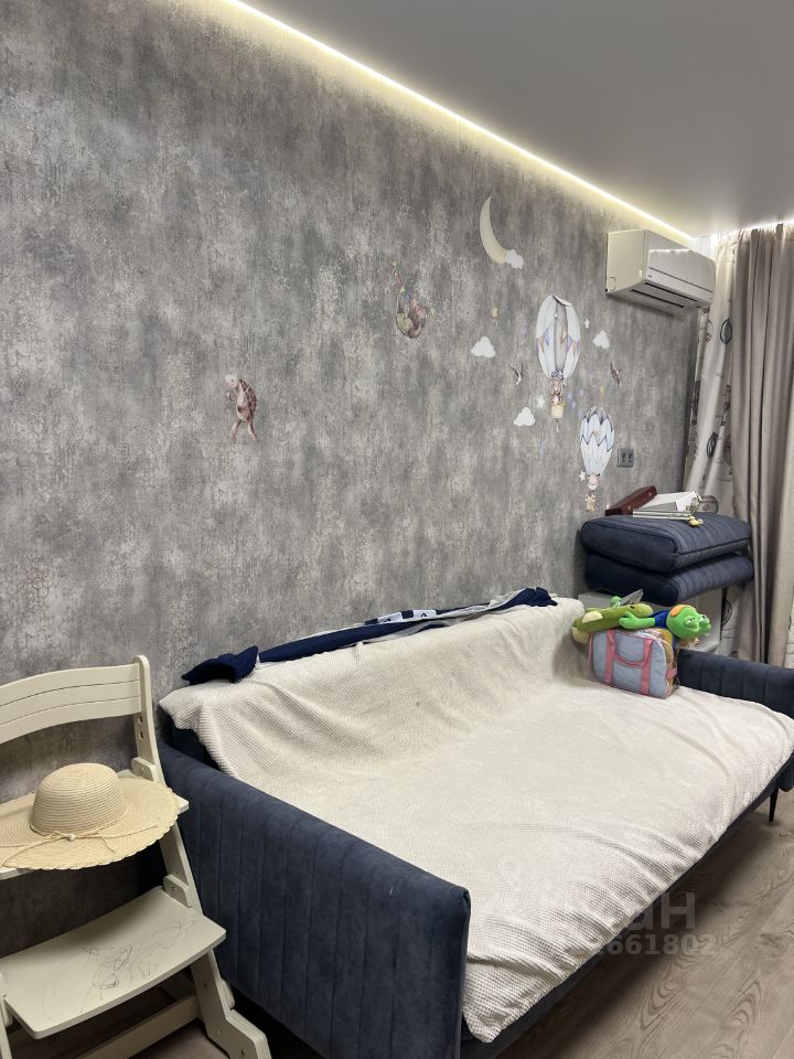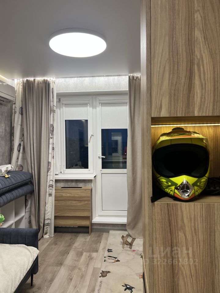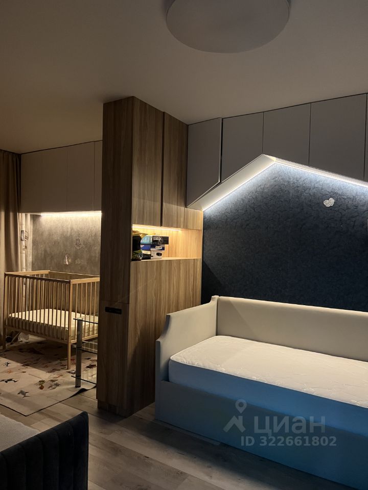 В большой комнате выполнен ремонт: контурная подсветка потолка, подсветка полок и под навесными шкафами, а так же два потолочных светильника и два настенных бра. Изобилие розеток, в том числе и интернет-розетка. Откидной стол (очень крепкий) для организации рабочего пространства при необходимости. Спальная зона с кроватью 90*200, а также изолированная гостиная/игровая зона (или для второго ребенка) с диваном. Диван в разложенном состоянии 160*200. Большое количество шкафов с разным объемом наполняемости, выдвижные ящики. Все пространство задействовано максимально. Римские занавески блекаут, балкон.
