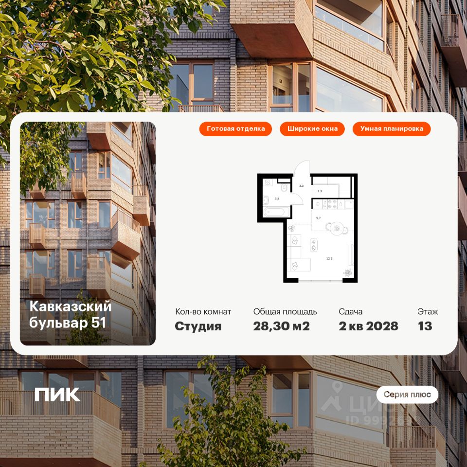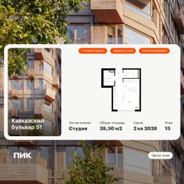 Продаётся квартира-студия площадью 28,3 кв.м на 13 этаже 23 этажного дома (Корпус 3.1, Секция 1) проекта ПИК Кавказский бульвар 51. Светлый просторный подъезд на уровне земли, функциональная планировка, большие окна, c отделкой.