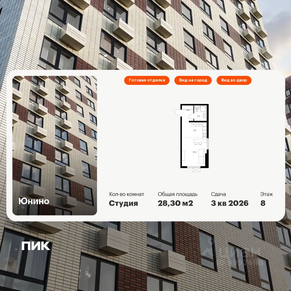 Продаётся квартира-студия площадью 28,3 кв.м на 8 этаже 17 этажного дома (Корпус 2.2, Секция 2) проекта ПИК Юнино. Светлый просторный подъезд на уровне земли, функциональная планировка, большие окна, c отделкой.