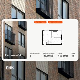Продаётся 2-комн. квартира площадью 45,6 кв.м на 18 этаже 33 этажного дома (Корпус 2.5, Секция 1) проекта ПИК Руставели 14. Светлый просторный подъезд на уровне земли, функциональная планировка, большие окна, c отделкой.