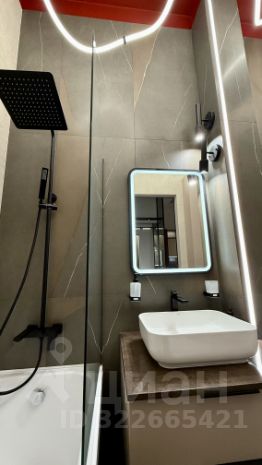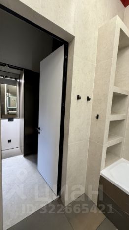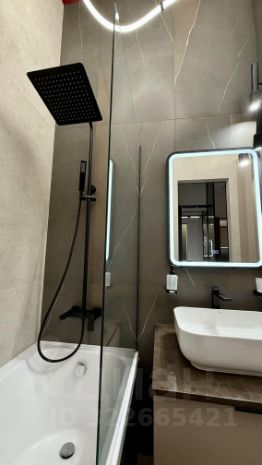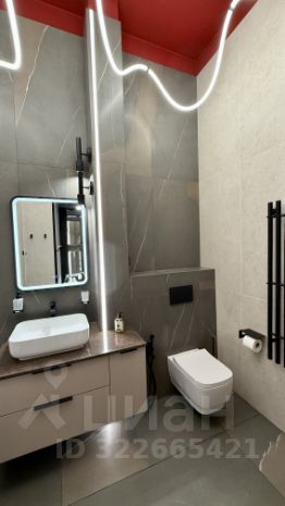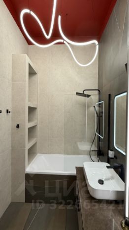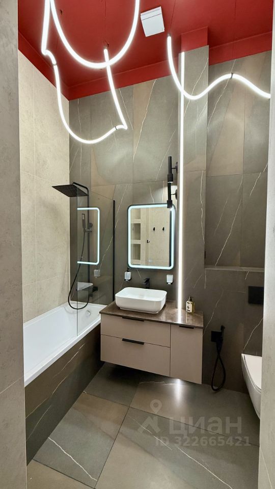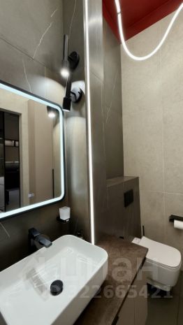 В ванной комнате выполнена современная отделка в спокойных оттенках с контрастными чёрными сантехническими элементами и встроенным освещением — стиль и комфорт на каждый день