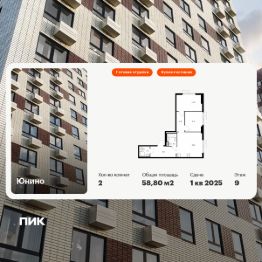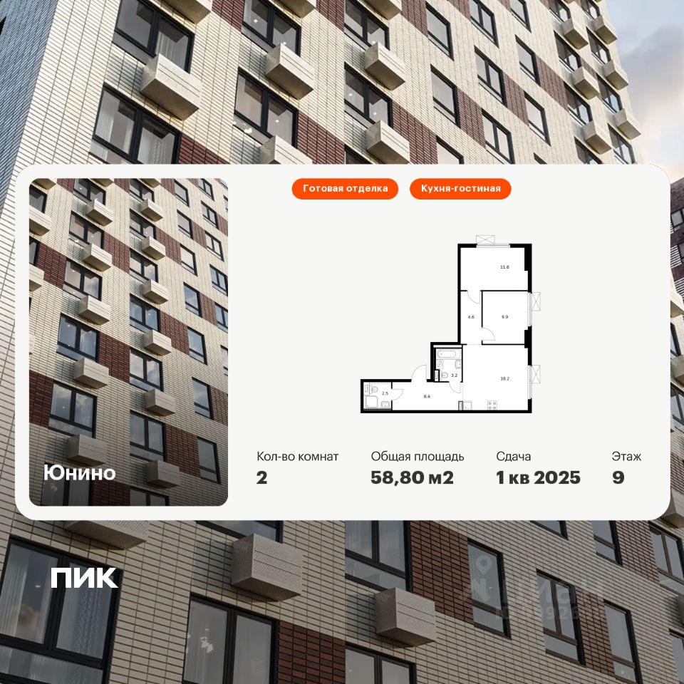 Продаётся 2-комн. квартира площадью 58,8 кв.м на 9 этаже 17 этажного дома (Корпус 1.2, Секция 1) проекта ПИК Юнино. Светлый просторный подъезд на уровне земли, функциональная планировка, большие окна, c отделкой.