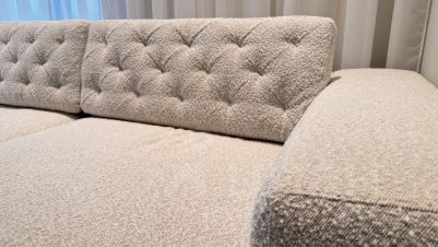 - Кровать в спальне в ткани букле по авторскому эскизу, матрас Ascona 26см.
