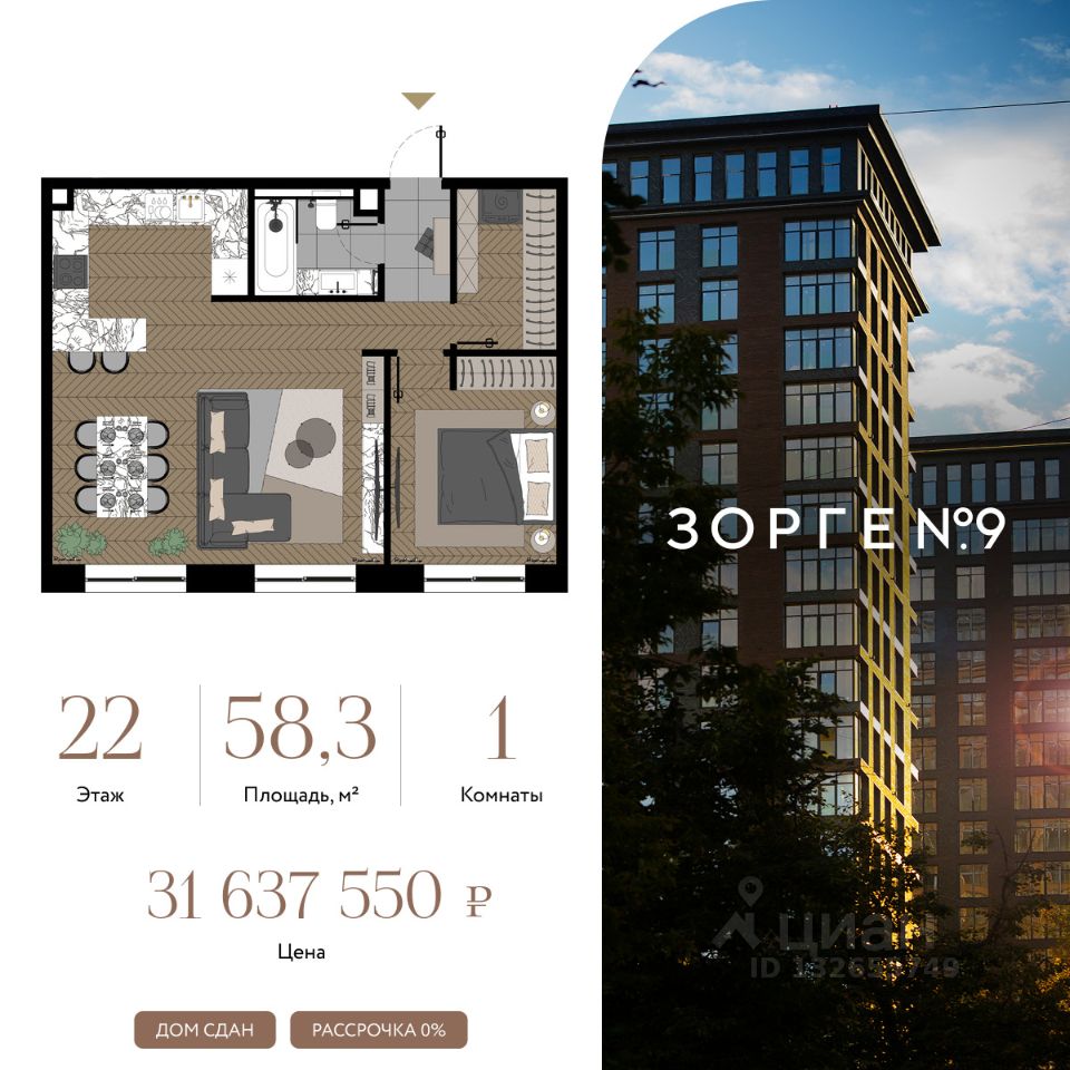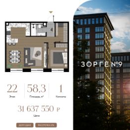 "Зорге 9" — это элегантные лобби с дизайнерской отделкой премиальными материалами, высокие потолки, панорамные окна, благоустроенный просторный двор в одном из лучших районов для жизни в Москве. Роскошная инфраструктура комплекса: консьерж-сервис, подземный паркинг, цифровой лифт, вход по Face ID, свой фитнес-клуб с бассейном, парк с сухим фонтаном, магазины и рестораны.