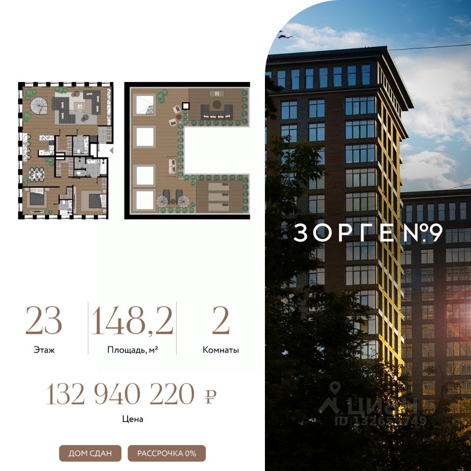 "Зорге 9" — готовые апартаменты бизнес-класса от компании St MICHAEL. 3 современных корпуса с фасадами в стиле архитектуры Нью-Йорка и с сервисами премиальных отелей, высотой до 21 этажа. На верхнем уровне комплекса расположены роскошные просторные пентхаусы с высотой потолка до 4,3 метра и панорамными окнами до 3,6 метров, открывающими великолепные виды на столицу. Пентхаусы с выходами на собственные приватные террасы на кровле, площадью от 150 кв. м являются жильем high-уровня, демонстрирующим высокий статус владельца. В них предусмотрена уникальная опция на потолках есть "световые фонари", дающие максимальный уровень света и воздуха.