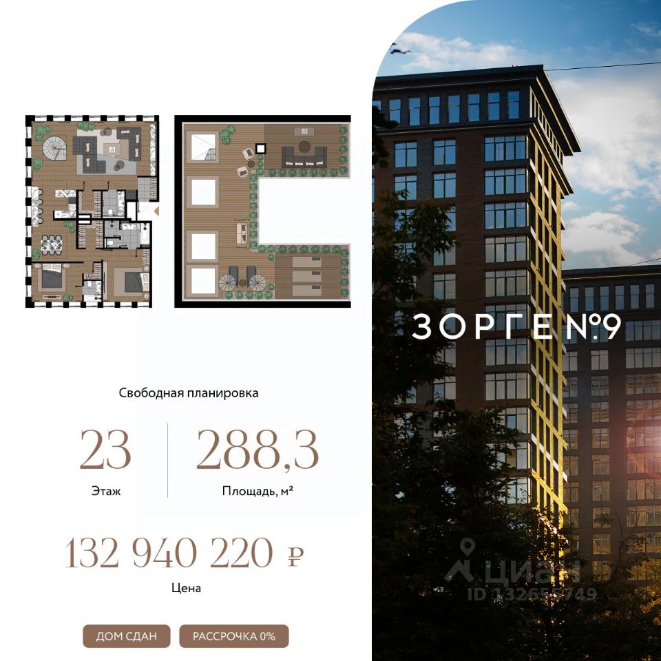 "Зорге 9" — готовые апартаменты бизнес-класса от компании St MICHAEL. 3 современных корпуса с фасадами в стиле архитектуры Нью-Йорка и с сервисами премиальных отелей, высотой до 21 этажа. На верхнем уровне комплекса расположены роскошные просторные пентхаусы с высотой потолка до 4,2 метра и панорамными окнами до 3,6 метров, открывающими великолепные виды на столицу. Пентхаусы с выходами на собственные приватные террасы на кровле, площадью от 150 кв. м являются жильем high-уровня, демонстрирующим высокий статус владельца. В них предусмотрена уникальная опция на потолках есть "световые фонари", дающие максимальный уровень света и воздуха.