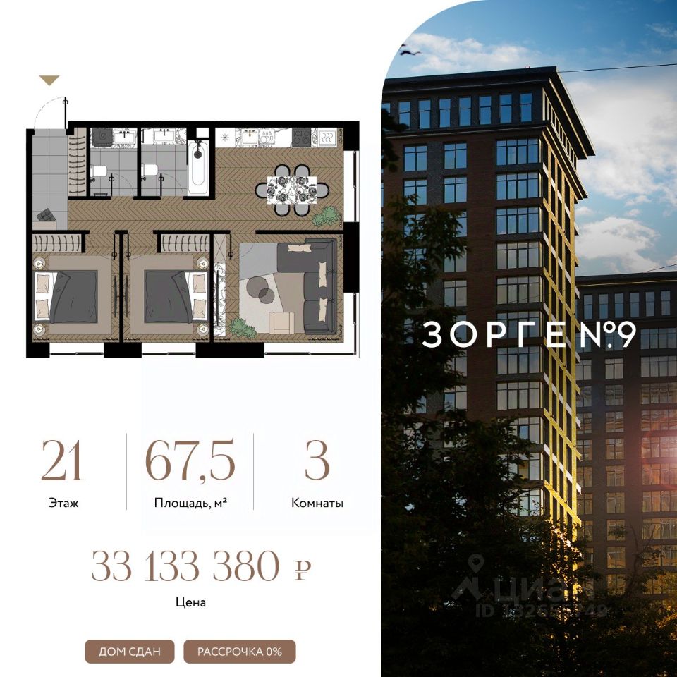 Апартаменты в готовом квартале бизнес-класса от компании St MICHAEL. Всего в комплекс входят 3 стильных высотных корпуса с модной архитектурой, собственным фитнесом и сервисами премиальных отелей. Отличная транспортная доступность и расположение в окружении крупных парковых зон характеризует комплекс как особенно привлекательный для жизни и инвестиционных вложений. На верхних уровнях комплекса расположены функциональные пространства с высотой потолка до 4,3 метров и панорамными окнами. В угловых апартаментах благодаря сплошному остеклению реализован эффект стеклянной стены. Элегантные лобби с дизайнерской отделкой премиальными материалами, lounge-зона для отдыха и встреч с гостями, кафе с камином и легким эмбиентом, стильная отделка холлов гармонично перекликается с фасадами в стиле архитектуры Нью-Йорка. "Зорге 9" — это элегантные лобби с дизайнерской отделкой премиальными материалами, высокие потолки, панорамные окна, благоустроенный просторный двор в одном из лучших районов для жизни в Москве. Роскошная инфраструктура комплекса: консьерж-сервис, подземный паркинг, цифровой лифт, вход по Face ID, свой фитнес-клуб с бассейном, парк с сухим фонтаном, магазины и рестораны. Представлен широкий выбор вариантов площадей от 27 до 81 кв. м, свободной планировки, с окнами в пол и высотой потолков до 4,3 м. Есть уникальные форматы пространств апартаменты с террасами, пентхаусы и хай-флеты. "Зорге 9" СДАН, все корпуса введены в эксплуатацию.
