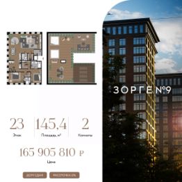 "Зорге 9" — готовые апартаменты бизнес-класса от компании St MICHAEL. 3 современных корпуса с фасадами в стиле архитектуры Нью-Йорка и с сервисами премиальных отелей, высотой до 21 этажа. На верхнем уровне комплекса расположены роскошные просторные пентхаусы с высотой потолка до 4,3 метра и панорамными окнами до 3,6 метров, открывающими великолепные виды на столицу. Пентхаусы с выходами на собственные приватные террасы на кровле, площадью от 150 кв. м являются жильем high-уровня, демонстрирующим высокий статус владельца. В них предусмотрена уникальная опция на потолках есть "световые фонари", дающие максимальный уровень света и воздуха.
