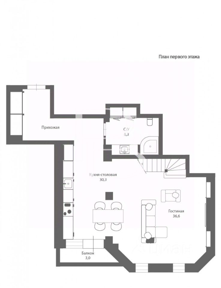 По плану на первом уровне обустроены холл, просторная гостиная - кухня - столовая с выходом на балкон, гостевой санузел.