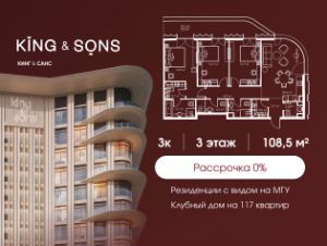 КИНГ энд САНС это клубный дом на 117 резиденций премиум-класса, расположенный на престижной и исторической улице Мосфильмовская. Из большинства квартир открываются панорамные виды на МГУ, "Москву-Сити", особняки посольств и парки. Это место для тех, кто не хочет выбирать между комфортом мегаполиса и уединением на природе. Проект разработан международным архитектурным бюро, которое входит в ТОП-2 в мире. Фасады из натурального камня, мягкие формы здания, максимально открытое остекление, окна в пол — все это делает облик здания выразительным и уникальным. В проекте предусмотрено 70% квартир с террасами. Потолки от 3,2 до 4,7 м. Паркинг на 110 машиномест. Для будущих резидентов продуманы разнообразные общественные пространства зимний сад в лобби первого этажа, секретный сад с зоной открытого огня, лаундж-зона с кинотеатром на крыше, собственный спортзал, зоны для занятий йогой и медитацией. КИНГ энд САНС это фамильная недвижимость, которую с гордостью передают по наследству