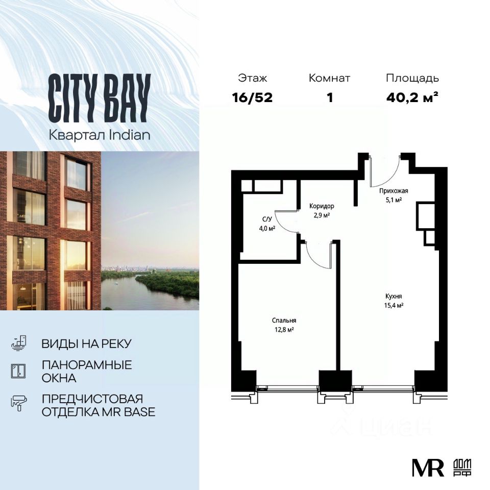 Продаётся 1-к квартира общей площадью 40.20 м² с предчистовой отделкой в ЖК City Вау на 16-м этаже 52 этажного дома.