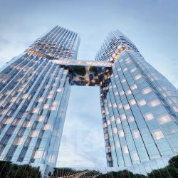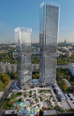 Архитектурная доминанта проекта — две величественные башни высотой 34 и 49 этажей, соединенные уникальным мостом на высоте 80 метров.
