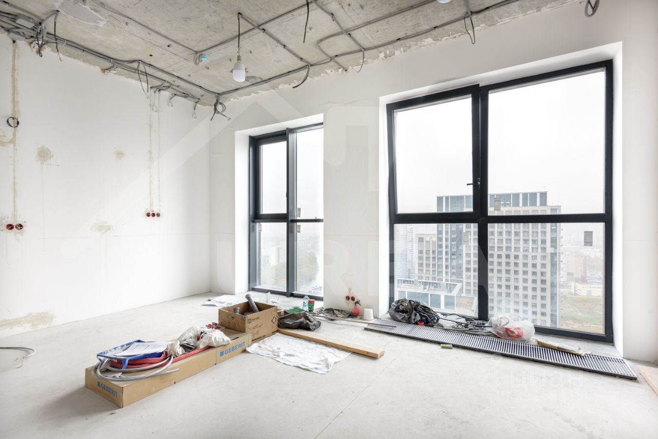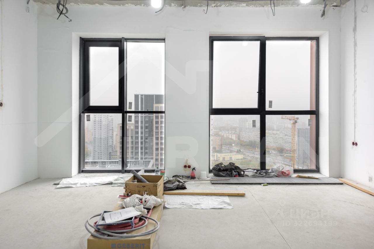 Общая площадь квартиры составляет 38 м². Квартира расположена на 34-м этаже нового 43-этажного монолитного дома, в районе "Хорошево-Мневники".