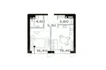 Планировка: кухня-гостиная, спальня, гардеробная, санузел.