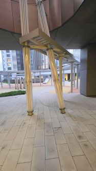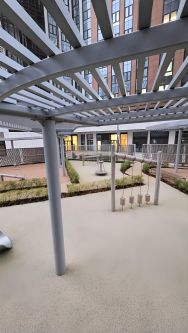 Внутренний двор представляет собой двухуровневое пространство с игровыми площадками для детей разного возраста на нижнем уровне, и местами для занятий спортом, йогой и деревянными террасами на верхнем уровне.