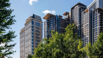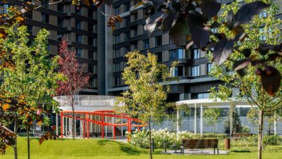 Главное о доме. "Событие" — городской квартал в Раменках, между длинными бульварами и зелёными массивами. Архитектура собирает башни и камерные корпуса в единую линию: спокойная палитра, крупные окна, чёткие вертикали. Во входных группах — натуральные материалы, мягкий свет, стойки ресепшн и зоны для коротких встреч. На стилобате проложили бульвары и дворы без машин с детскими и спортивными площадками и несколькими тихими лаунж-зонами. Внутри работают клубные пространства и небольшие кабинеты для работы. Паркинг со спуском на лифте связывает уровень улицы и жилые этажи.