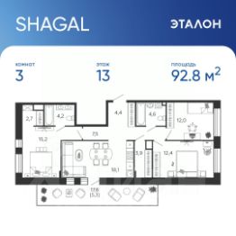 Продается 3-к квартира без отделки в ЖК "Shagal".