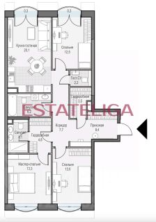 Планировка - распашонка. Метраж: кухня-гостиная - 20,1; спальные комнаты - 13,6, 12,5 мастер-спальня - 13,32 с санузлом 4,06; большой совмещенный санузел - 6,15;