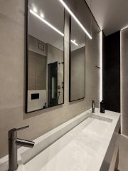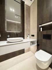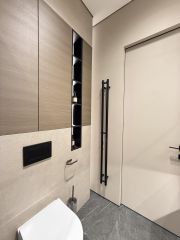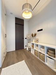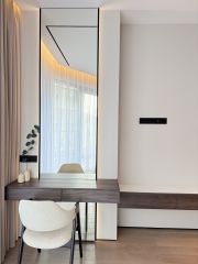 3. Вся мебель выполнена под заказ согласно дизайн проекту с использованием премиальных материалов в том числе: шпон, кварцевый агломерат, акриловый камень, фурнитура Blum, Hettich. Установлена гардеробная система SPACE с поворотным механизмом Grand Ultra.