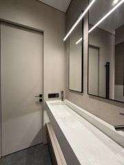 2. В чистовой отделке использовали паркетную доску, стеновые панели из натурального шпона, двери invizible высотой 2300, двери из натурального шпона с фрамугами до потолка, теневой плинтус.