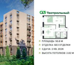 В современном квартале бизнес-класса G3 Театральный продаётся 1-комнатная квартира, общей площадью 50.8 кв.м, расположенная на 3 этаже (корпус 2, секция 1).