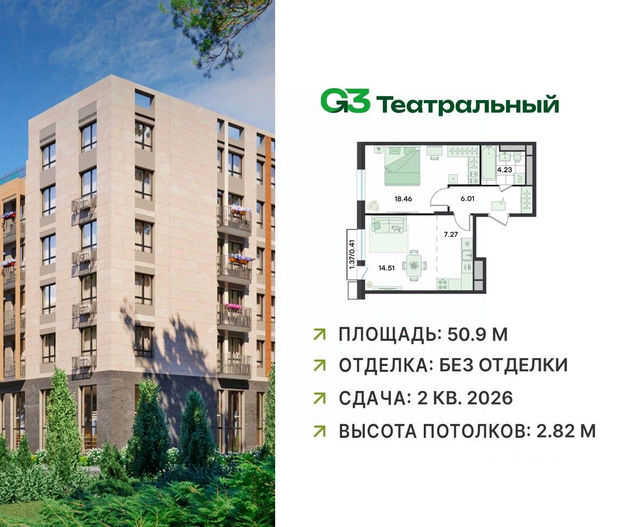 В современном квартале бизнес-класса G3 Театральный продаётся 2-комнатная квартира, общей площадью 50.9 кв.м, расположенная на 3 этаже (корпус 2, секция 6).
